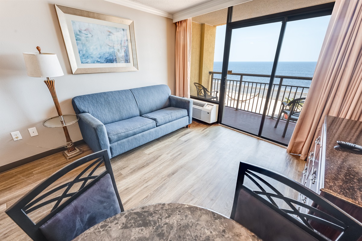 This condo which is situated in Caravelle Resort, has a fantastic view of the ocean from its eighth-floor balcony. This condo sleeps up to six people with one king bed, one murphy bed, and one sleeper sofa. Found at Caravelle Resort in Myrtle Beach, South Carolina! This oceanfront one-bedroom apartment has a refrigerator, microwave, cooktop, stove, LCD TVs, and a private bathroom With a BEAUTIFUL walk in shower!.