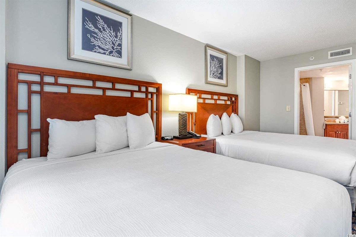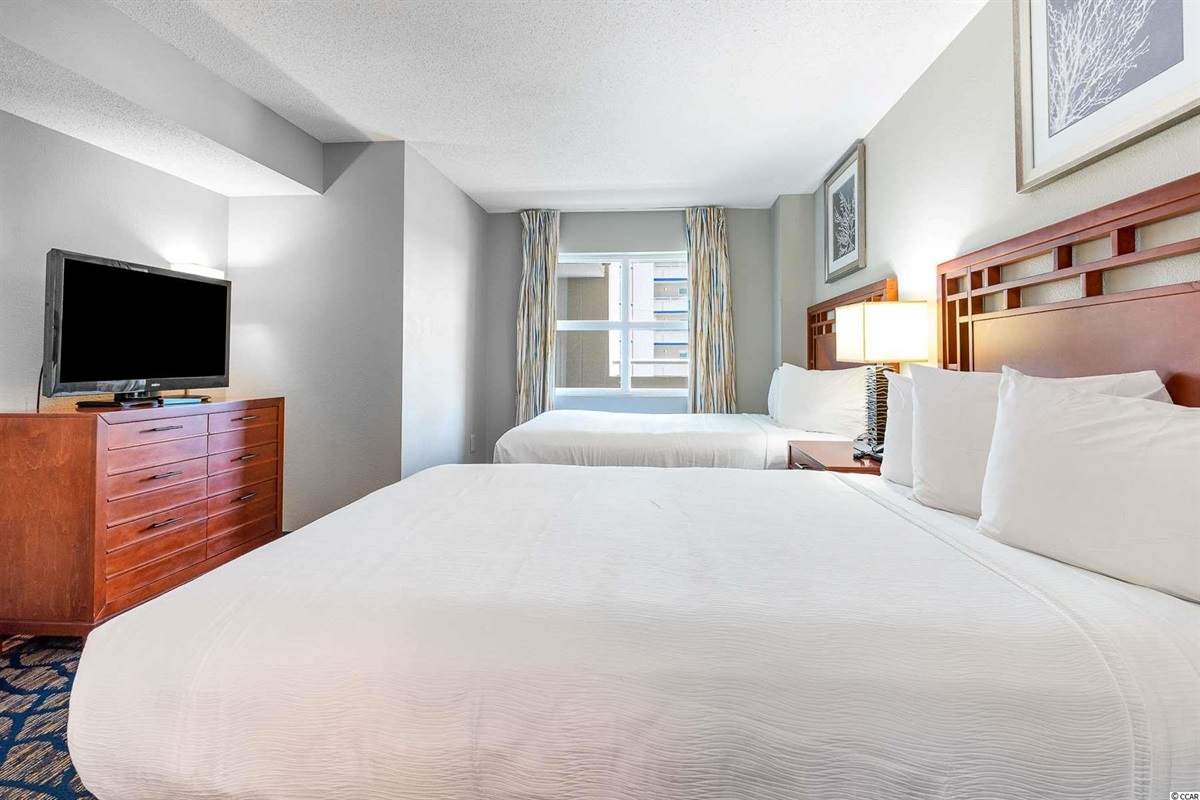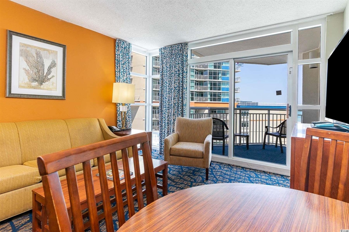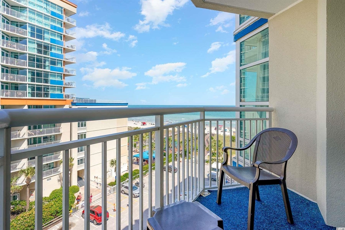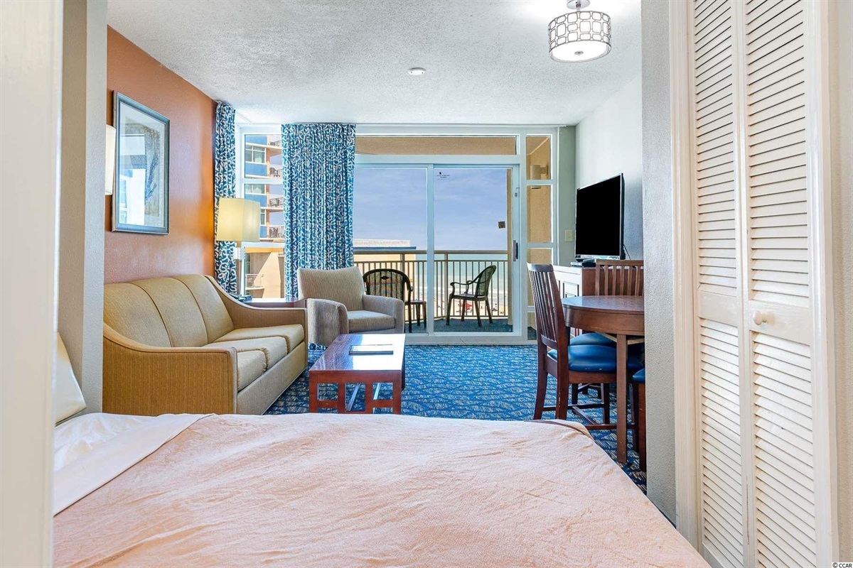 Beautiful fully furnished oceanview 1 Bedroom at Dunes Village Resort. Enjoy stunning ocean views from the balcony, perfect for your morning coffee or evening cocktails. The unit includes a kitchen with a stove, microwave, and full-sized fridge. It features 2 Queen beds, a Sleeper Sofa, and a Murphy bed, along with a dining table. Onsite amenities include outdoor and indoor pools, water slides, kiddie pools, a lazy river, hot tubs, a sauna, a fitness room, an onsite restaurant serving three meals, a poolside Tiki bar, and Starbucks Coffee. The 30,000-square-foot indoor water park offers a Lazy River, Jacuzzi hot tubs, two adult-sized water slides, and a children's pool and game room with pool tables and other arcade games. Abundant amenities await you at this beachfront resort, and best of all, free WiFi! "Conveniently located and within steps of the beach," just 7 miles from the airport, 5 miles from Family Kingdom, and 2 miles from Myrtlewood Golf Course. Many other restaurants and attractions are nearby, including Broadway at the Beach, Market Common, and Ripley's Aquarium. This oceanview condo sleeps 8, featuring 2 Queen beds, a Sleeper Sofa, and a Murphy bed, along with a private bathroom and full-sized appliances. Wake up to a sunrise on your private balcony overlooking the ocean.